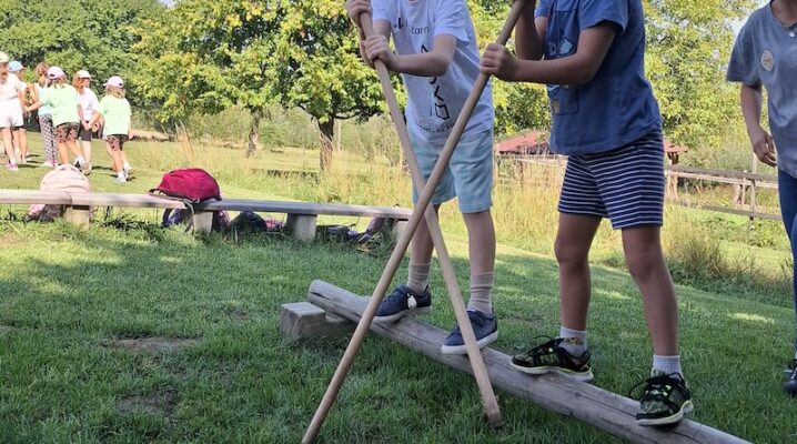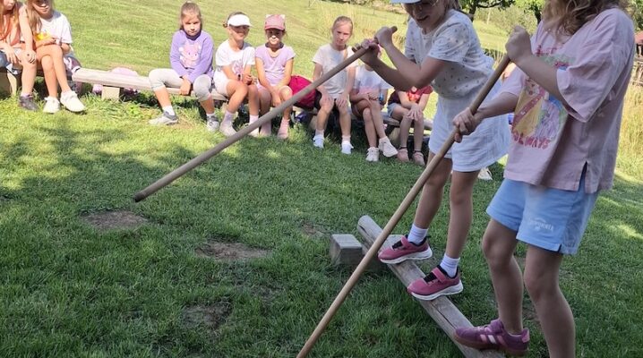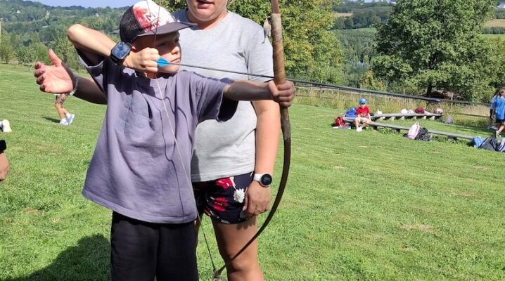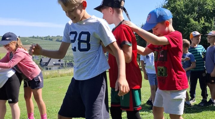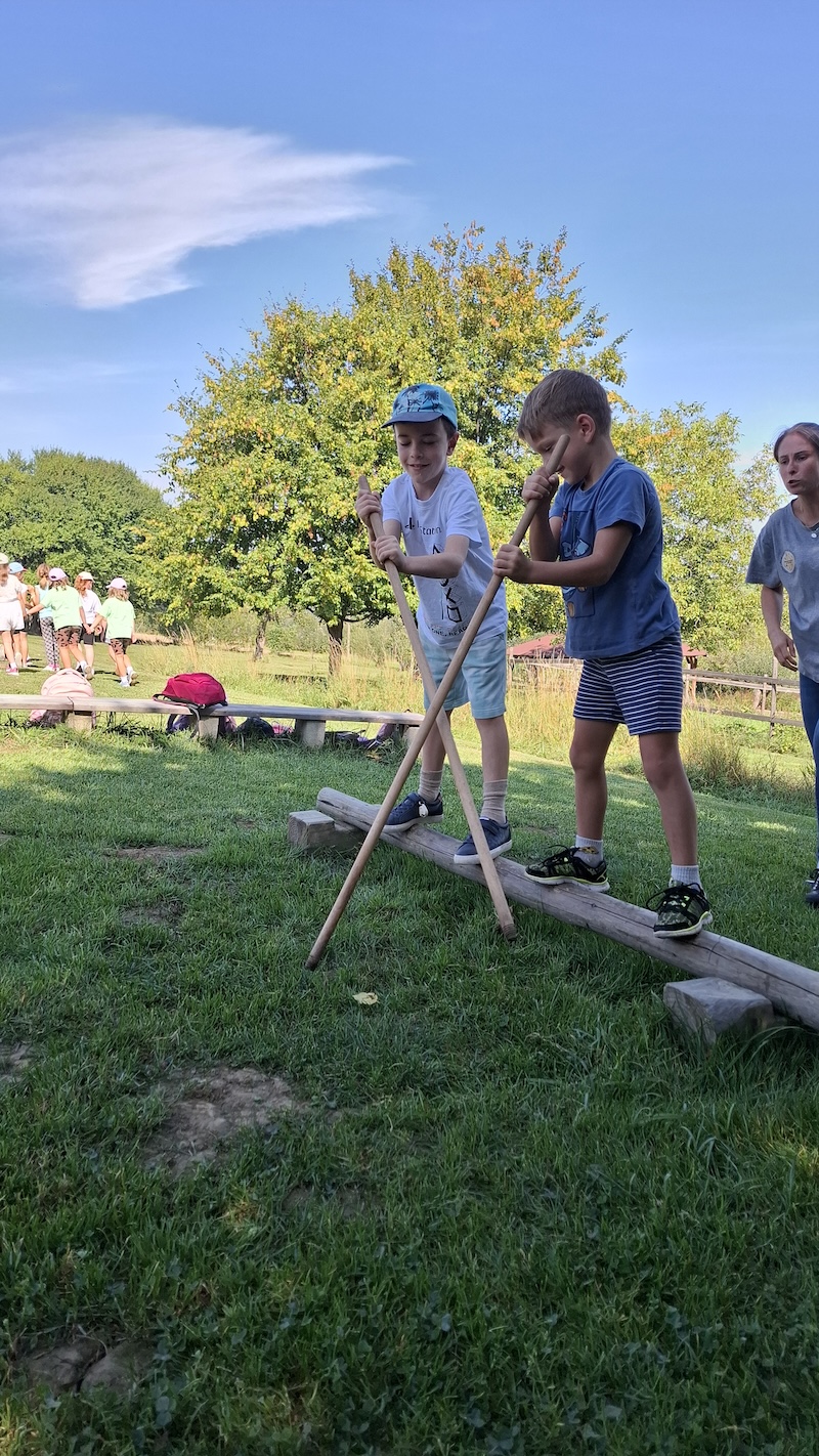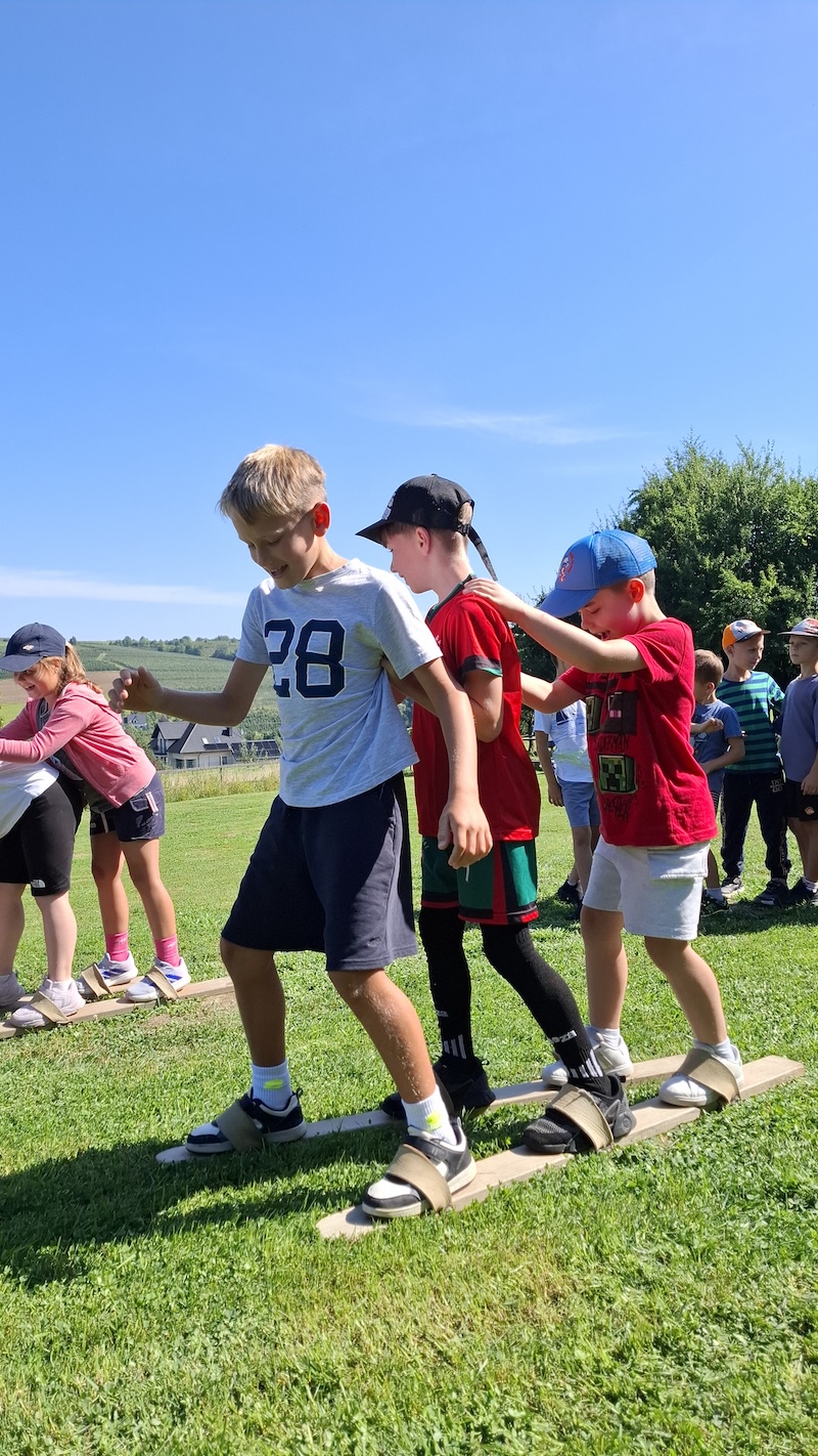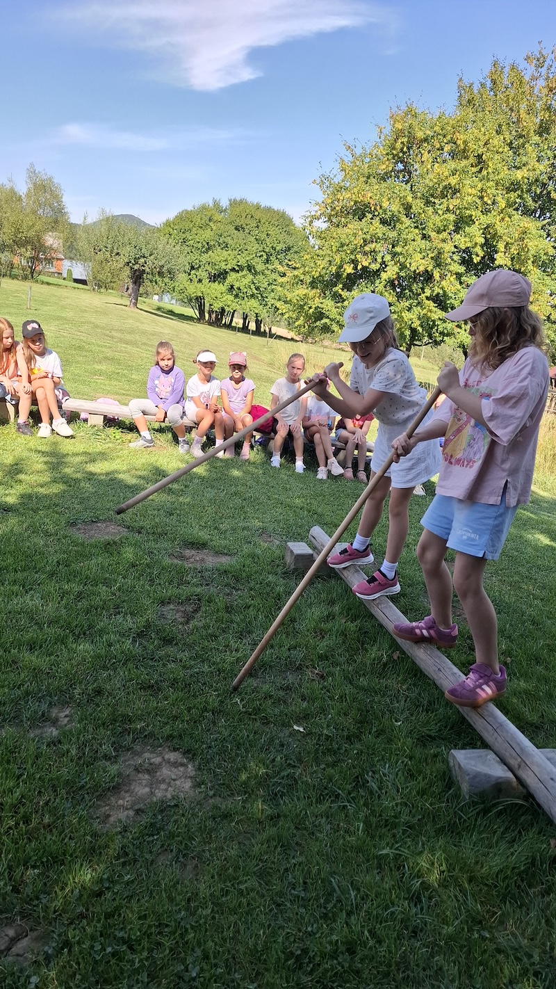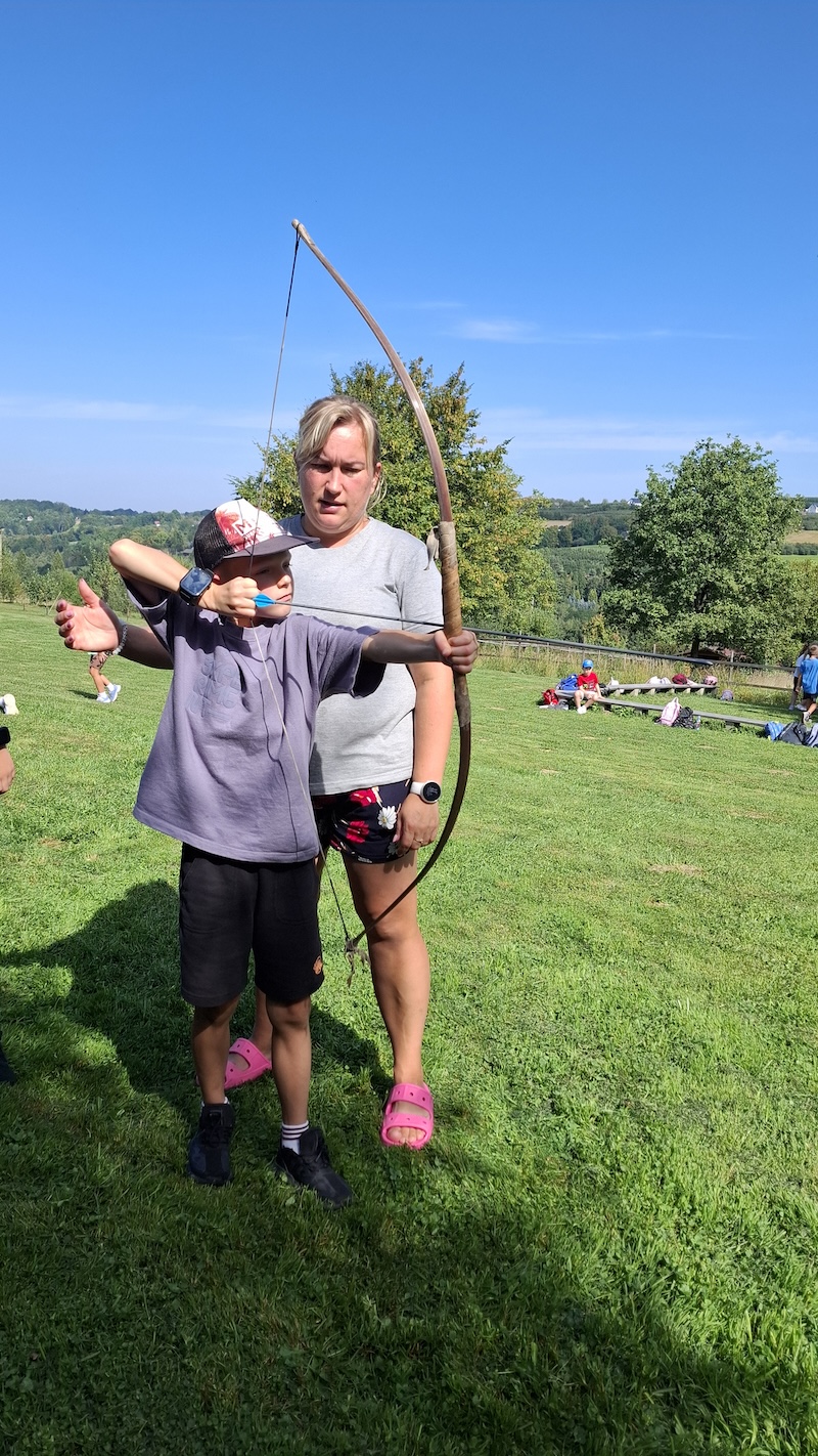 Na dzieci czekały również inne atrakcje. Wszystkie miały możliwość strzelania z łuku do tarczy, toczyly pojedynki na równoważni, brały udział w wyscigach na trzyosobowych nartach , bawiły się w „Kręciołka”, aż w końcu wyczerpani udaliśmy się na posiłek – kiełbaski pieczone na grillu.