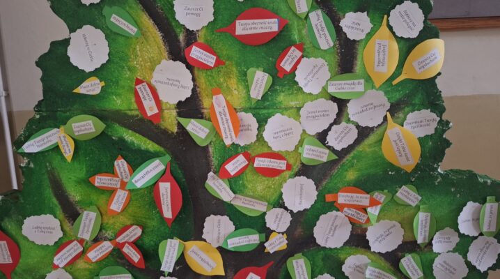 Czasem trudno nam wyrazić swe uczucia, dlatego z pomocą przyszło drzewko życzliwości… z jego owoców, listków i śnieżynek można było korzystać do woli, przekazując mile słowo…