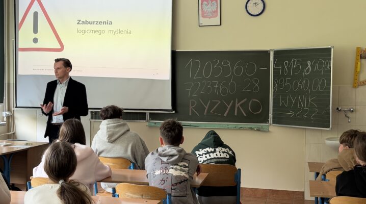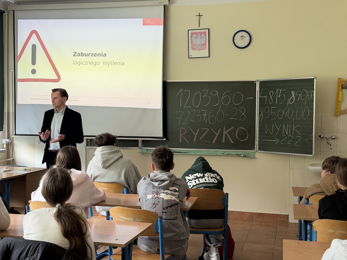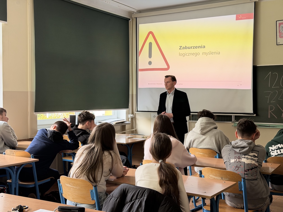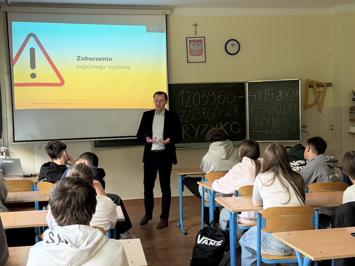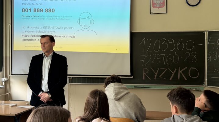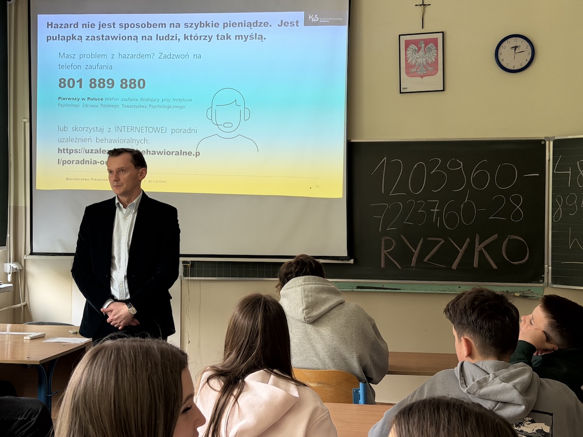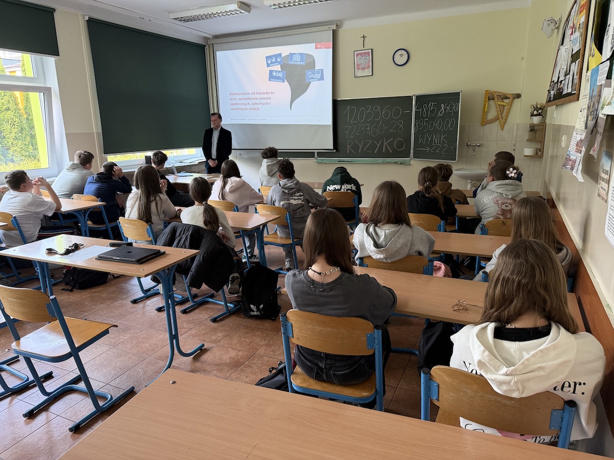 Uczniowie klas IV – VIII naszej szkoły wzięli udział w zajęciach profilaktycznych pt. „Hazard – nie daj się wciągnąć”, prowadzonych przez pracownika Urzędu Skarbowego – Pana Mateusza Wawrzonka. Podczas spotkania młodzież miała okazję dowiedzieć się, jakie zagrożenia niesie ze sobą hazard oraz jakie mogą być jego konsekwencje prawne i finansowe. Prowadzący zwrócił uwagę na mechanizmy uzależnienia oraz sposoby unikania ryzykownych zachowań. Zajęcia były cenną lekcją odpowiedzialności i świadomego podejmowania decyzji. Serdecznie dziękujemy prowadzącemu za poświęcony czas, zaangażowanie oraz przekazanie w przystępny sposób tak ważnej wiedzy.