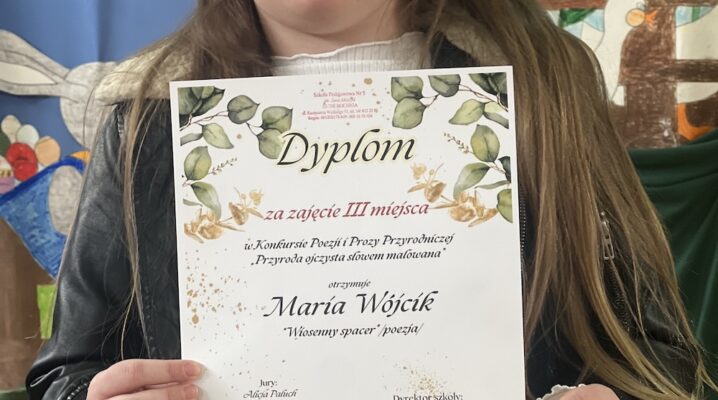 III miejsce w kategorii poezja otrzymała nasza uczennica Maria Wójcik z klasy II D za wiersz „Wiosenny spacer” .