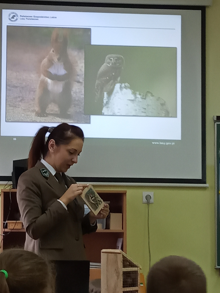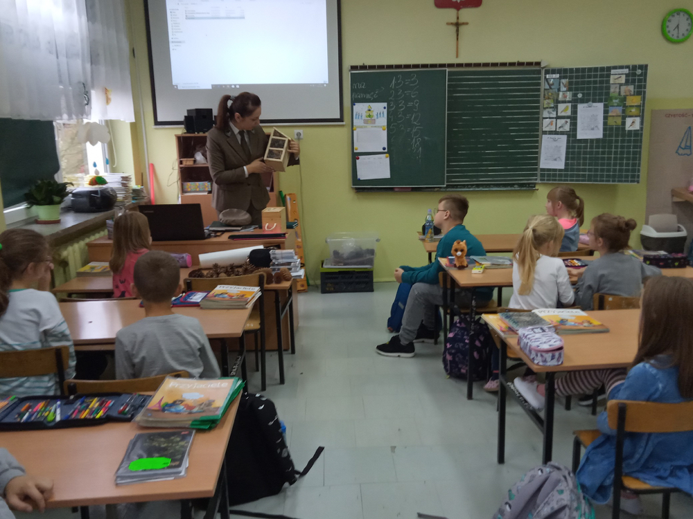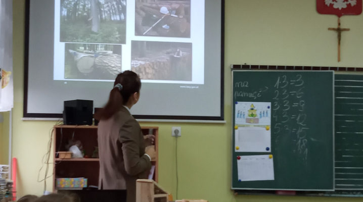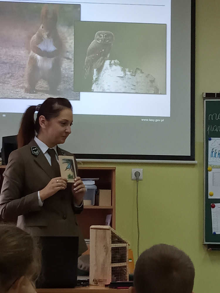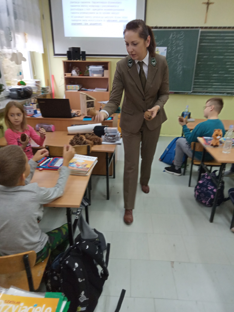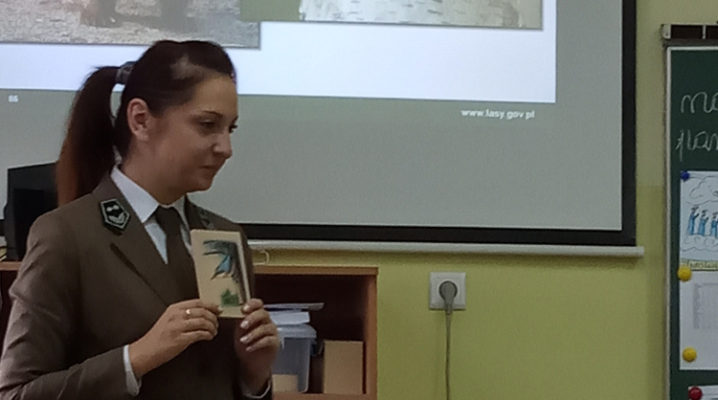 5 listopada klasę 2c odwiedziła pani leśnik. Opowiadała ona na temat swojej pracy, zwierząt żyjących w lesie i ich ochrony, roślin tam występujących oraz właściwego zachowania podczas kontaktu z otaczającą nas przyrodą. Dowiedzieliśmy się dużo o trudach życia zwierząt w okresie zimy i znaczącej roli człowieka w ich dokarmianiu. Wyjaśniła również, że ludzie są gośćmi w lesie i muszą szanować zwyczaje gospodarzy, czyli zwierząt w nim żyjących. Mieliśmy również okazję oglądnąć różnego rodzaju okazy przyrodnicze pochodzące z lasu. Na zakończenie tego miłego i radosnego spotkania zostaliśmy obdarowani odblaskami, folderami informacyjnymi na temat lasów i ich mieszkańców oraz plakatami. To był naprawdę udany dzień!