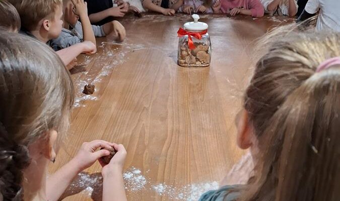 ozdobami , które wykonywało się dawniej. Własnoręcznie upiekliśmy i ozdobiliśmy pierniczki . Udaliśmy się również do zagrody, gdzie dzieci miały okazję pokarmić zwierzątka oraz każdy miał szanse spróbować doić „prawdziwą” krowę.