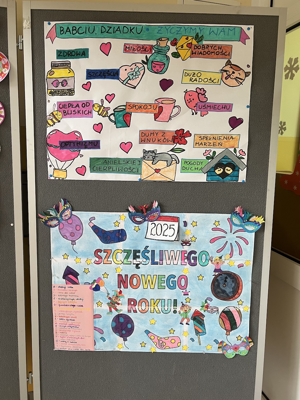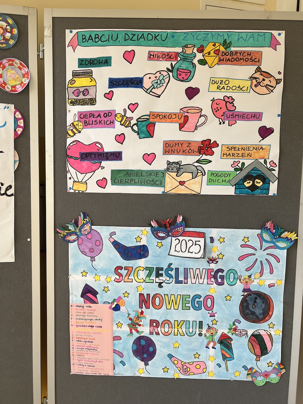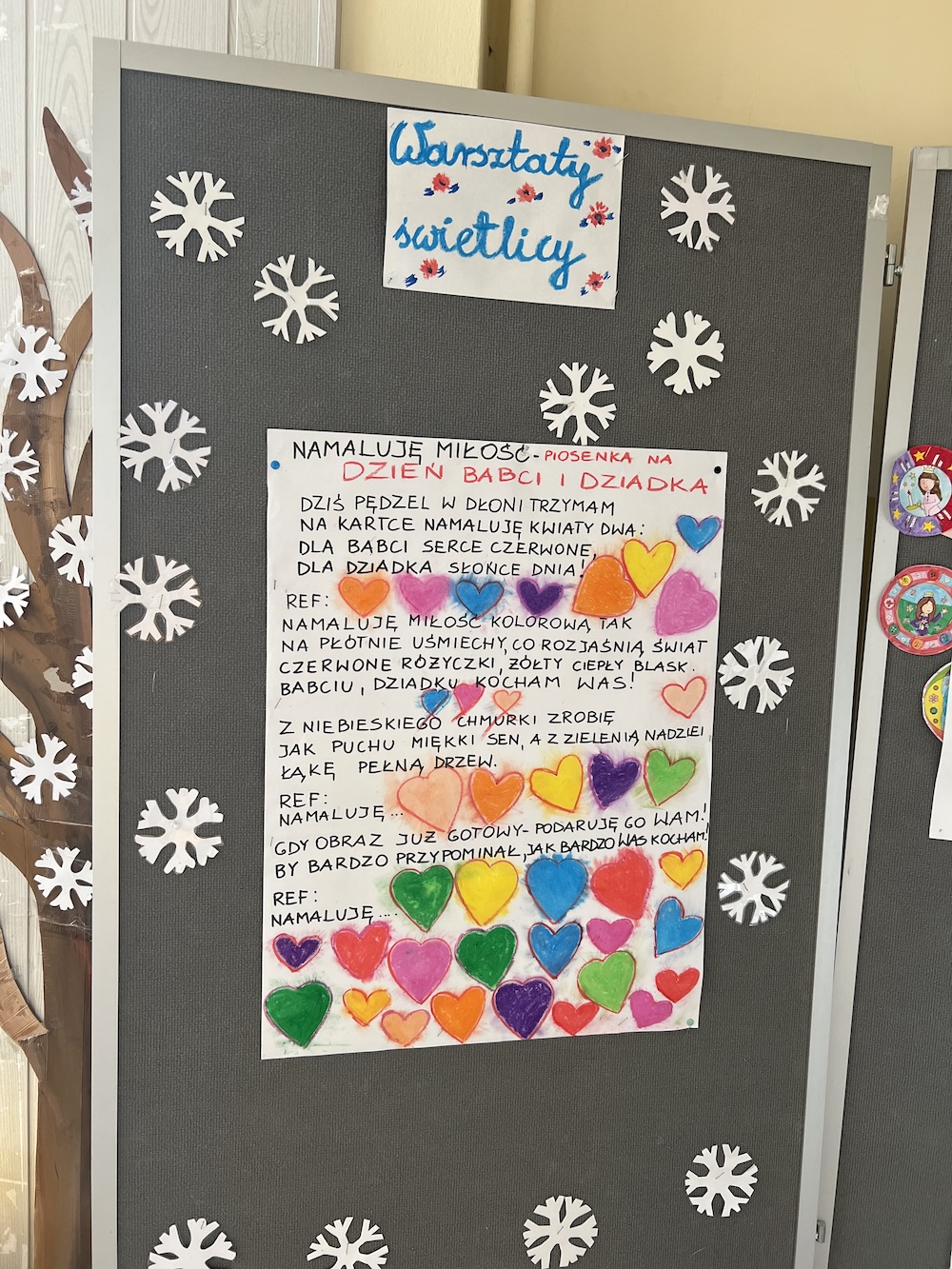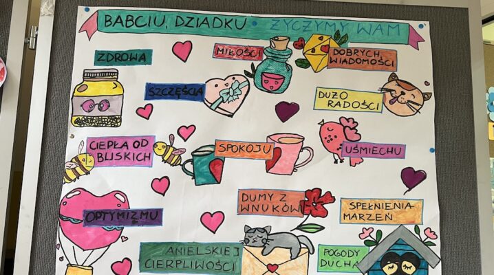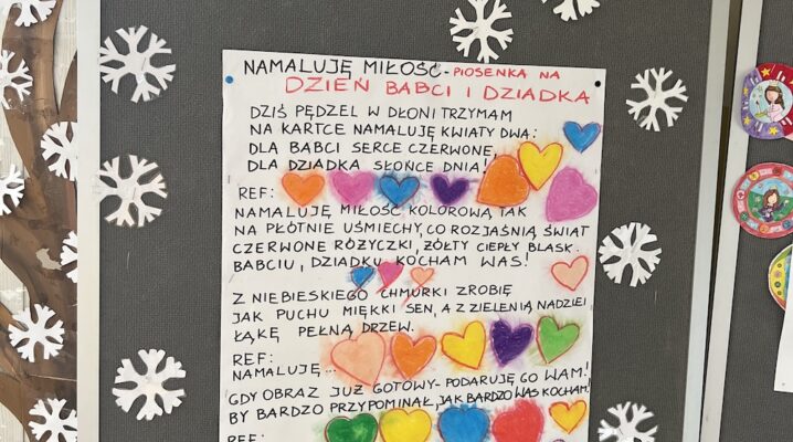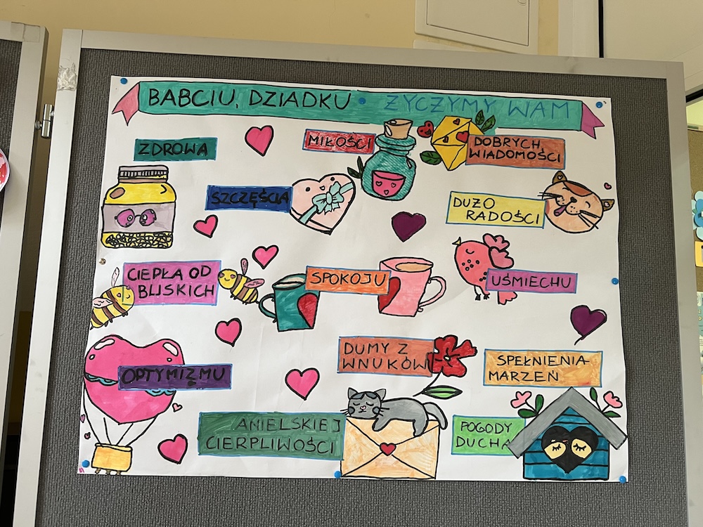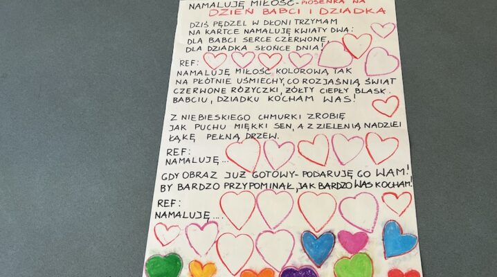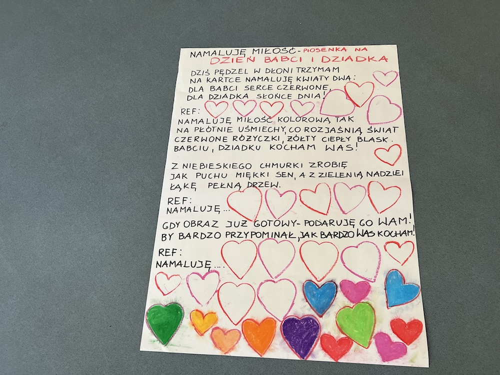 Życzenia oraz piosenka „Namaluje miłość” na Dzień Babci i Dziadka- życzenia na plakacie- warsztaty świetlicy.